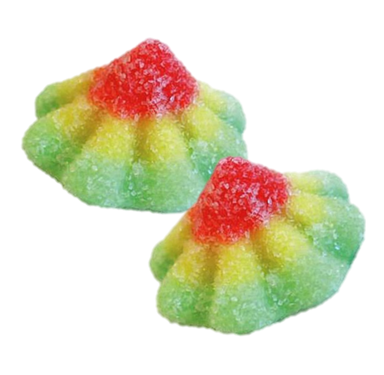Refrescantes gomas em forma de talhada de melancia, coberta com uma fina camada de açucar.