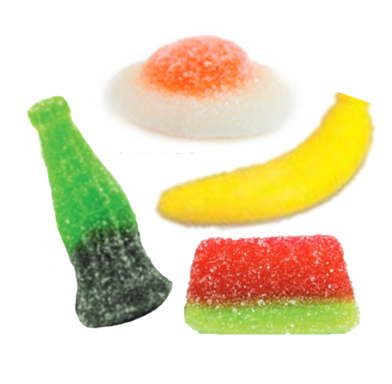 Açúcar, xarope de glucose, água, gelatina; acidificante: E330; aromas; corantes: E102, E129, E133.