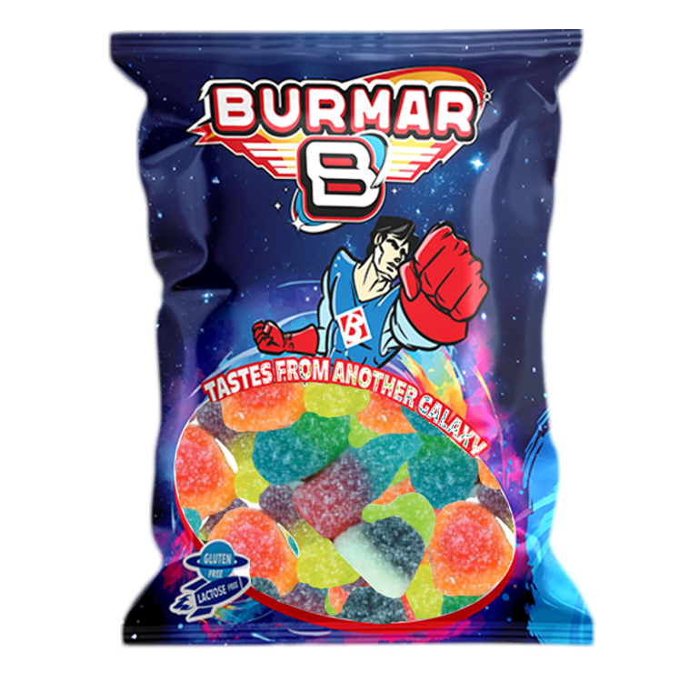 Açúcar, xarope de glucose, água, gelatina; acidificante: E330; aromas; corantes: E102, E129, E133.