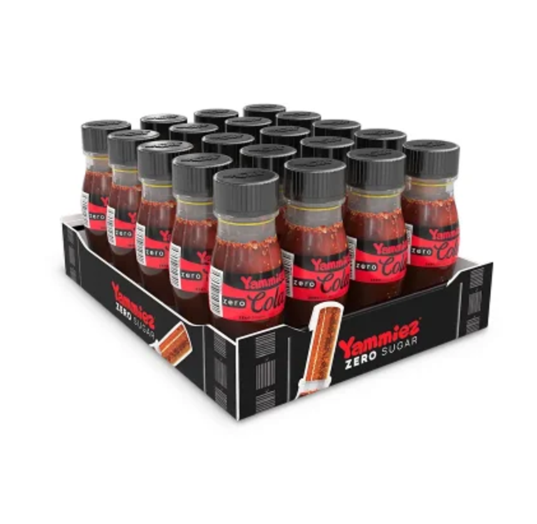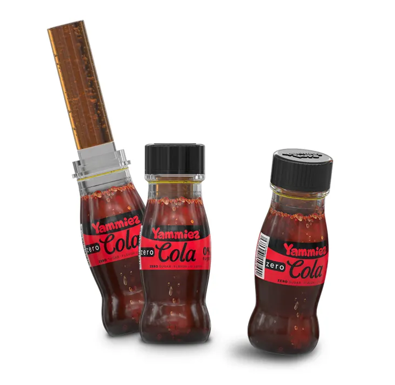 Açúcar, xarope de glucose, água, regulador de acidez (ácido láctico, lactato de sódio), aromas, corantes (E163, E133, E150d).