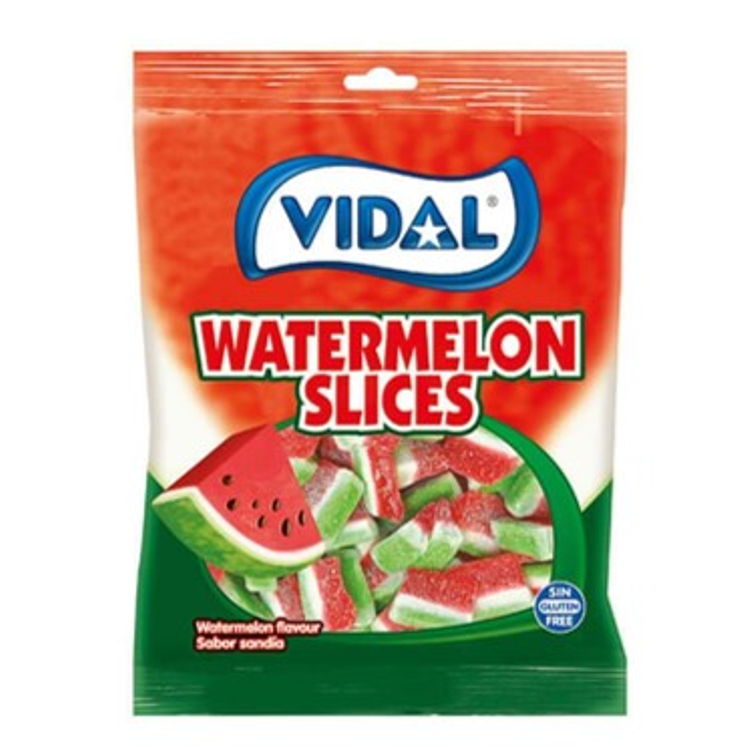 Refrescantes gomas em forma de talhada de melancia, coberta com uma fina camada de açucar.