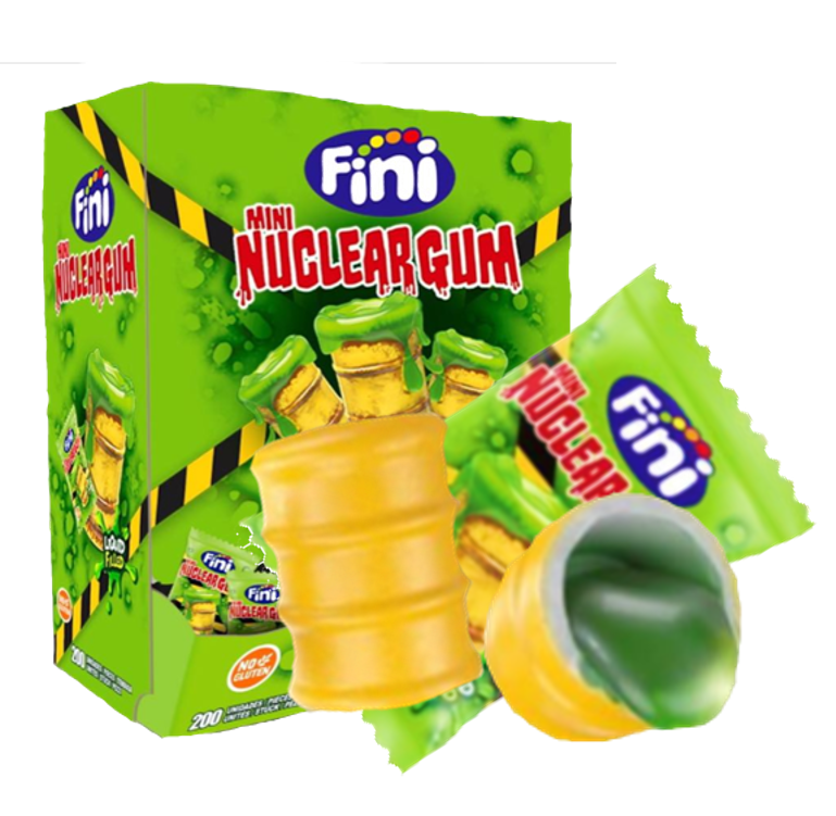 INGREDIENTES: Açúcar, xarope de glucose, goma base (lecitina de soja), aromas, acidulantes (E270, E296), regulador de acidez (E325), agentes de revestimento (E901, E903, E904), corantes E100, E133. Informações Nutricionais CONSERVAÇÃO: Guardar em lugar fresco e seco. Nome do Produtor Fini Golosinas Espanha, S.L.U. INFORMAÇÃO: Confirmar a informação no rótulo do artigo. Devido a possíveis alterações de embalagens e/ou rótulos, deverá considerar sempre a informação que acompanha o produto que recebe. (Imagem ilustrativa)