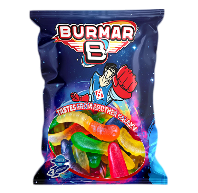 Xarope de glucose, açúcar, água, amido modificado de batata, gelatina, acidulantes (E330, E296, E270), aromas, corantes.